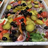 Fresh lettuce, tomatoes, green peppers, red onions, cucumbers, and black olives. Supersized for your party.