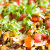 Ground beef, lettuce, tomatoes, onions, cheddar cheese & taco sauce.