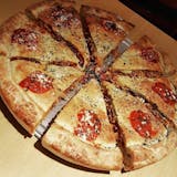 Mozzarella & provolone on the bottom, topped with vodka sauce, tomato sauce & pesto.