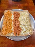 square thin crust with mozzarella cheese on the bottom and Penne Vodka, Fettuccine Alfredo and Baked Ziti on top. Choose up to 3 pastas. Note choices in instructions. No substitutions.